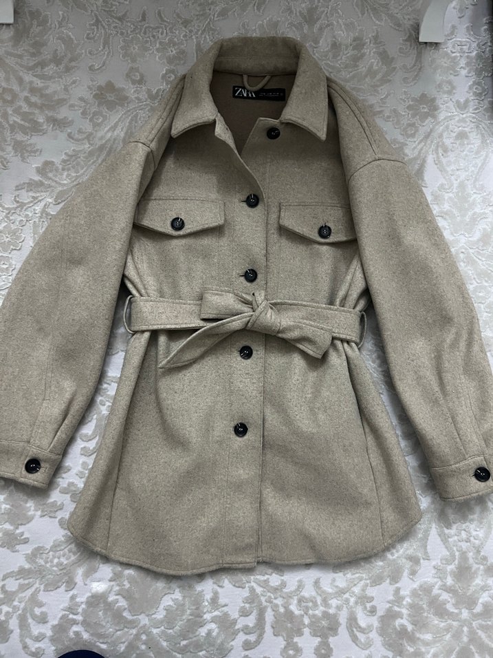 Bej keten kumaştan yapılmış, düğmeli, kemerli ve uzun kollu midi ceket. Rahat ve bol kesimiyle günlük kullanıma uygundur.çok sıcak tutuyor