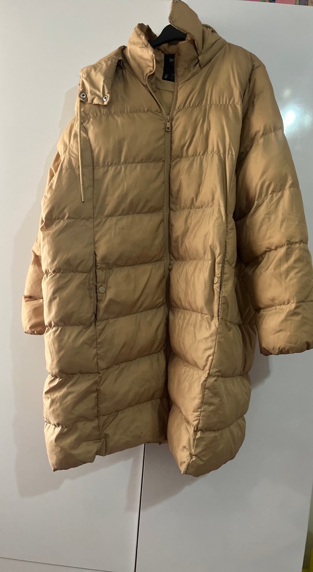 Bej renkte, düğmeli ve kesik yaka detaylı kadın kışlık mont. Gevşek kesimi ve uzun kollu yapısıyla rahat ve parlak görünümlü, günlük kullanıma uygun sıcak tutar.