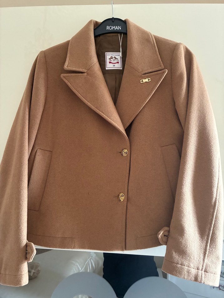 Bej renkli kadın kaban, klasik kesim ve düğmeli kapama ile midi boyda. Yumuşak ve sıcak kumaştan, uzun kollu ve desen yok. Ofis için uygun,us polo marka.
