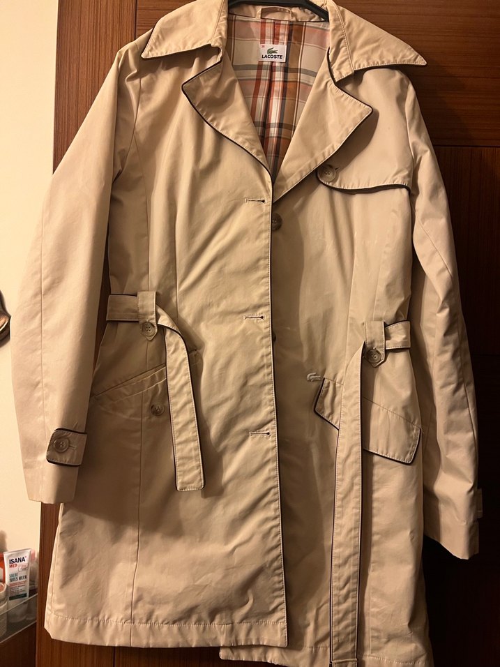 Orjinal lacost ürünü. Bej renkli, düğmeli midi uzunlukta kadın trençkot. Notch yaka ve uzun kolludur, İç astarı burberry desenlidir. Yaka ve manşetleri kahverengi biyelidir. İlkbahar ve sonbahar için kullanıma uygundur.