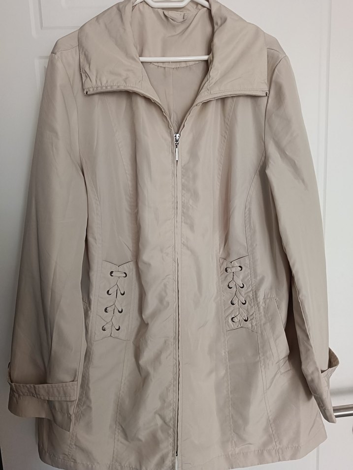 Bej renkli, uzun kollu, düğmeli ve fermuarlı, cep kısmında bağcıklı detaylı, sentetik kumaştan midi uzunlukta bol kesim kadın rüzgarluk ölçüleri iki kol altı en 58 cm boy 76 cm
