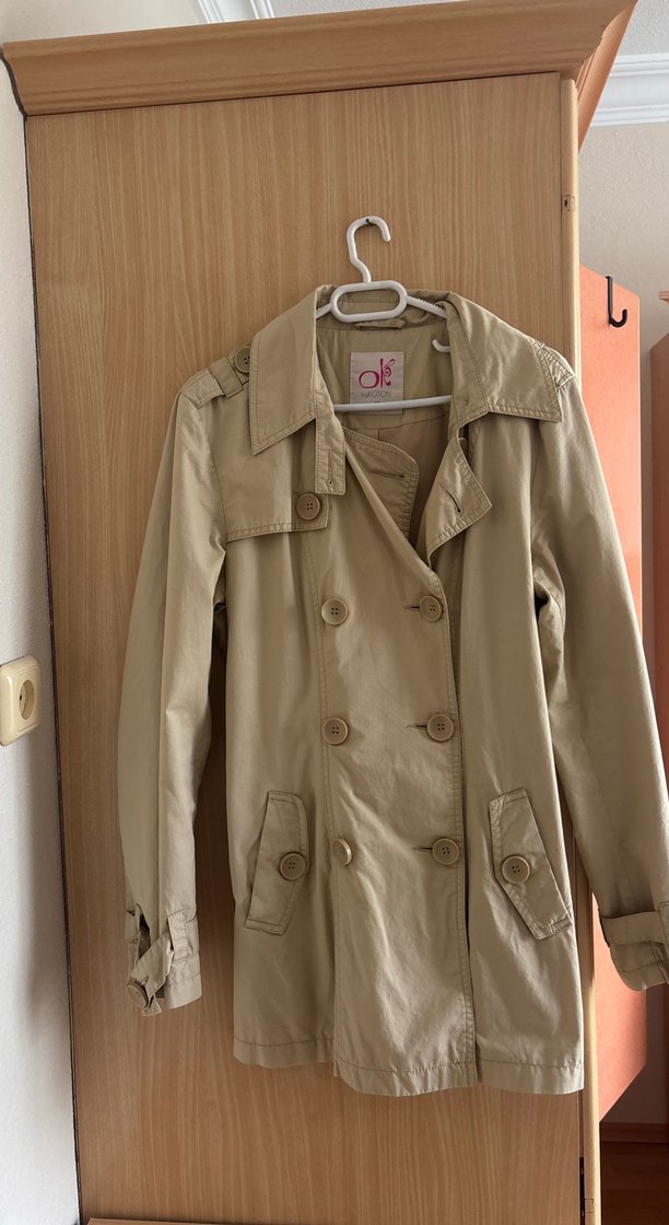 Bej renkli, düğmeli ön ve kesimli yakalı midi uzunlukta kadın trençkot. Uzun kollu, bol kesim , günlük sokak tarzı için uygun. 40 beden