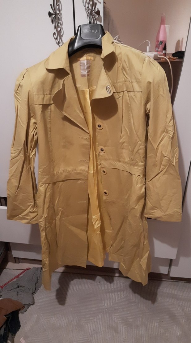 Bej renkli, düğmeli ön kapamalı ve kesik yakalı midi trençkot. Uzun kollu, normal kesim ve parlak sentetik kumaştan, günlük sokak stiline uygun. boy 90 santim resimde renk tam çıkmıyor fıstık yeşili mevsimlik