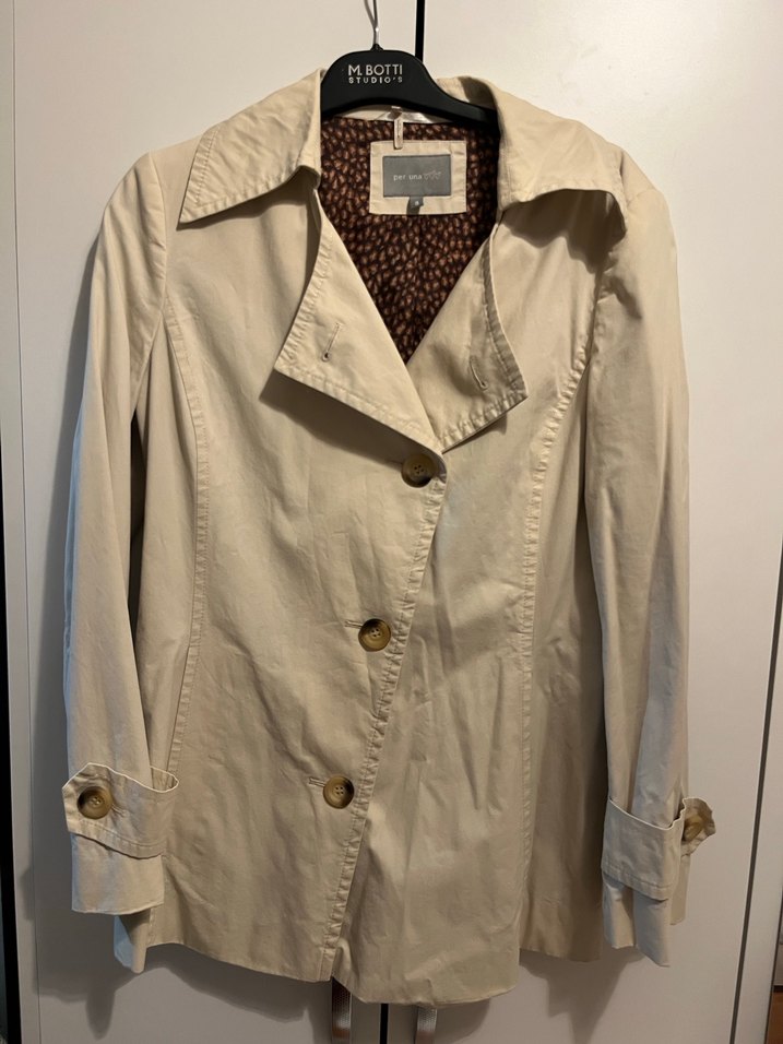 Bej pamuk trençkot, düğmeli kapama, keskin yaka ve uzun kollu. Normal kesim ve midi boy, ofis için uygun.