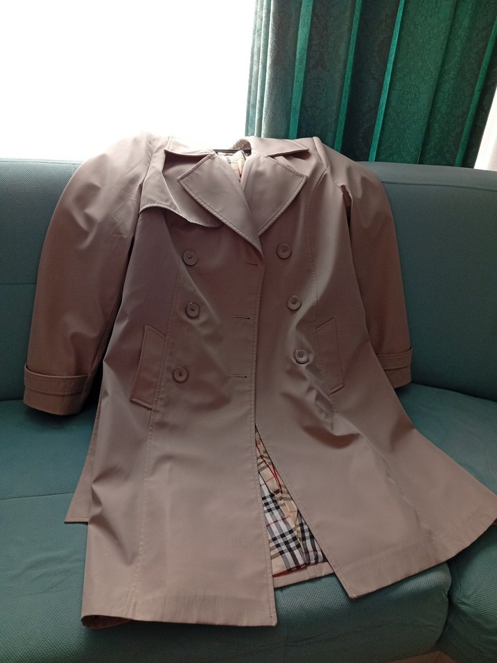 Bej renkli, düğmeli midi uzunlukta kadın trençkot. Uzun kollu, klasik sokak tarzında, sentetik kumaştan, günlük kullanıma uygundur.