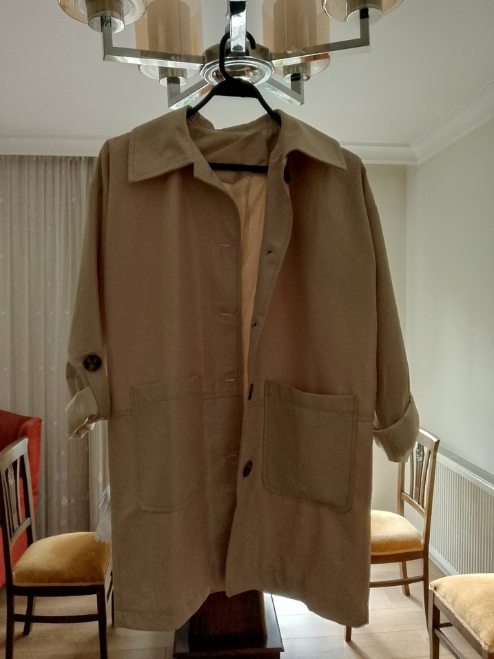 Bej renkli keten kumaştan, düğmeli, uzun kollu, cepli, bol kesim midi trençkot. Rahat ve günlük sokak stili için uygun.