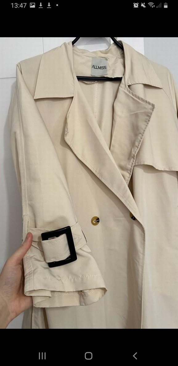 çok şık ve rahat sorunsuzdur. Bej renkli, düğmeli, notlu yaka kadın trençkot. Sentetik kumaştan, bol kesim ve askılı kollu, midi boyda, minimalist tarzda günlük kullanıma uygun. Marka: ALLMISS.
