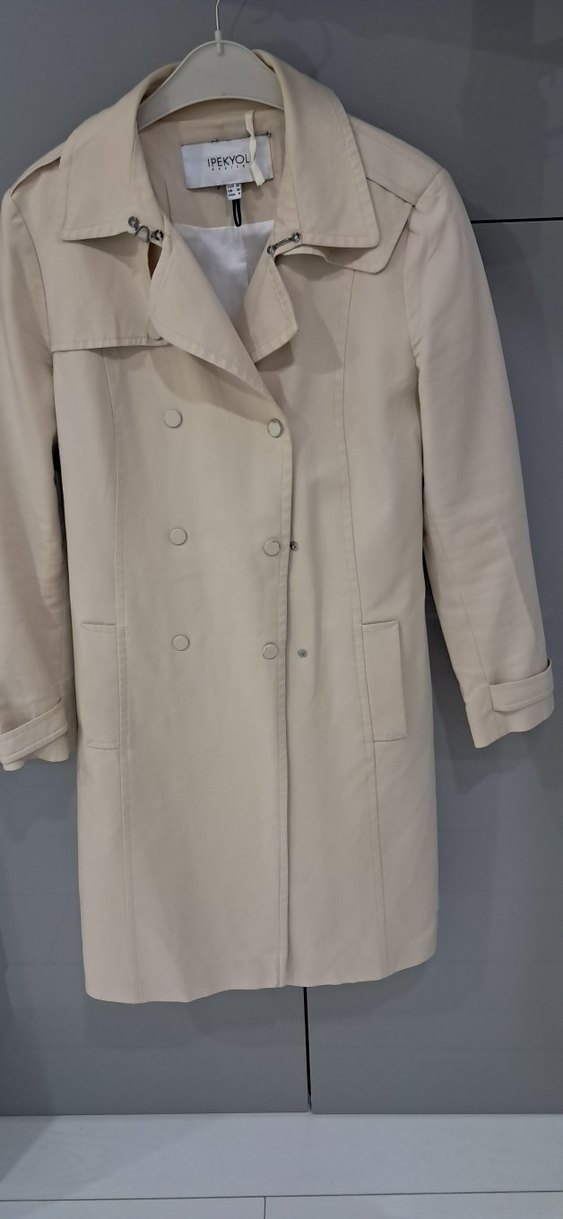 Bej midi uzunlukta, düğmeli ve kesimli yakalı kadın trençkot. Uzun kollu, regular fit ve ofis kullanımı için uygundur. ön iki düğmesini çocuk tırnaklamış çok az giyildi fiatı uygun o yüzden