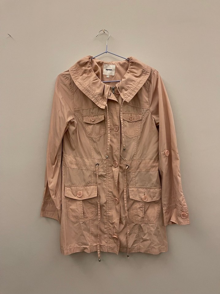 Bej renkte, uzun kollu, düğmeli ve cepli midi uzunlukta rahat kesim kadın trençkot. Sokak stiline uygun günlük kullanıma uygun.