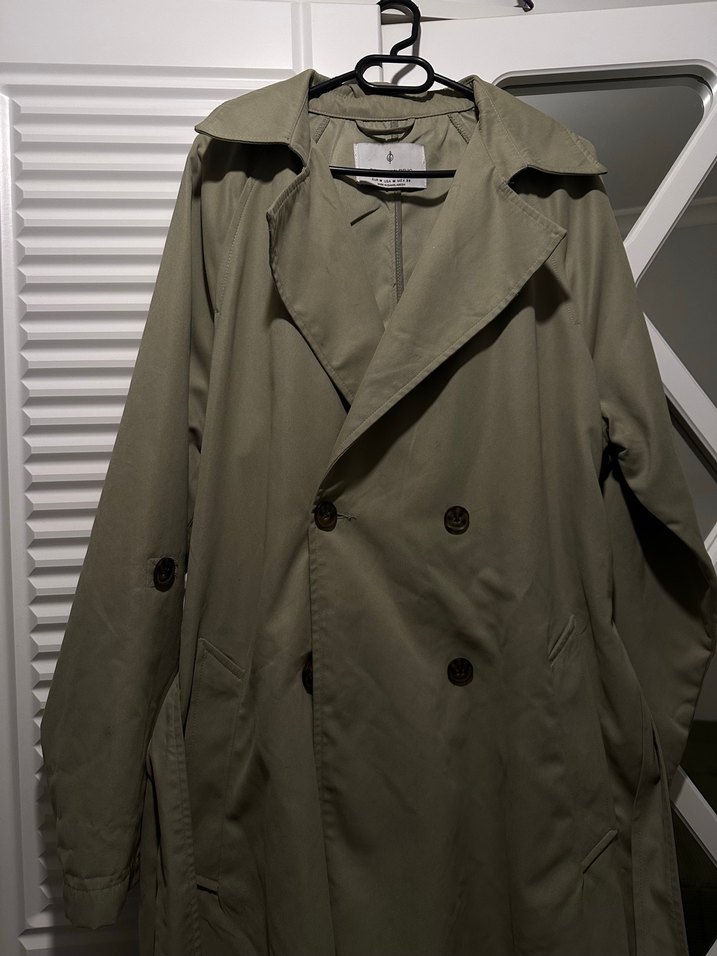 Bej renkte, düğmeli, normal uzunlukta midi trençkot. Uzun kollu ve bol kesim, sentetik kumaştan, günlük sokak stili için uygundur.