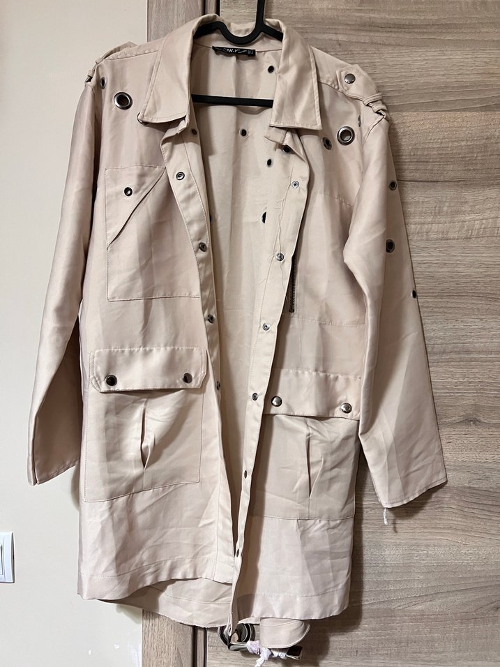Bej renkli keten kumaştan, uzun kollu ve bol kesim, düğmeli detaylı, notched lapel yakalı midi trençkot. Günlük kullanıma uygun. Sorunsuz