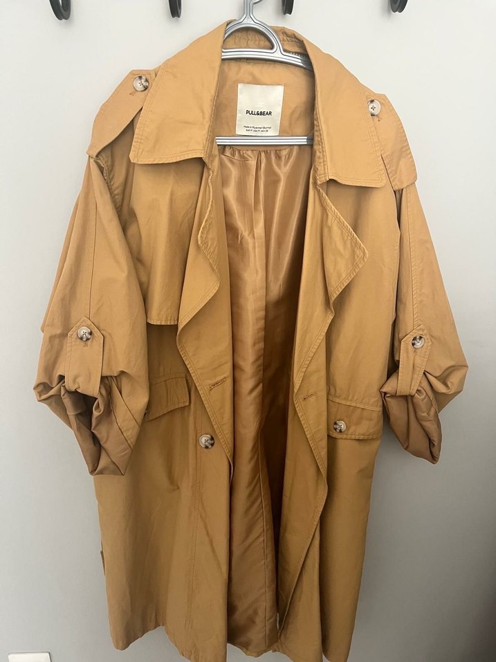 Bej renkli, düğmeli, midi trençkot. Kısa kollu, geniş kesim ve çıt detaylı, rahat ve şık bir sokak stili parçası. ✨
