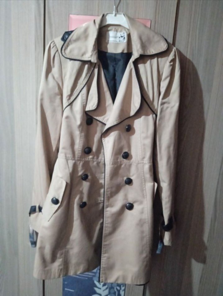 Bej renkte, düğmeli ve askılı kollu midi uzunlukta kadın trençkot. Sentetik kumaştan, rahat kesimli ve gündelik kullanıma uygun.