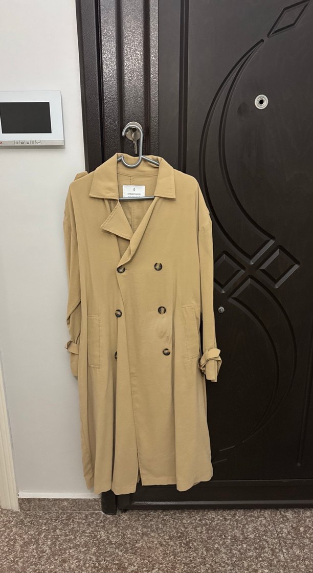 Bej renkli keten kumaştan, düğmeli, normal boy midi trençkot. Uzun kollu, loose fit kesimiyle gündelik kullanıma uygun, sade tasarım.