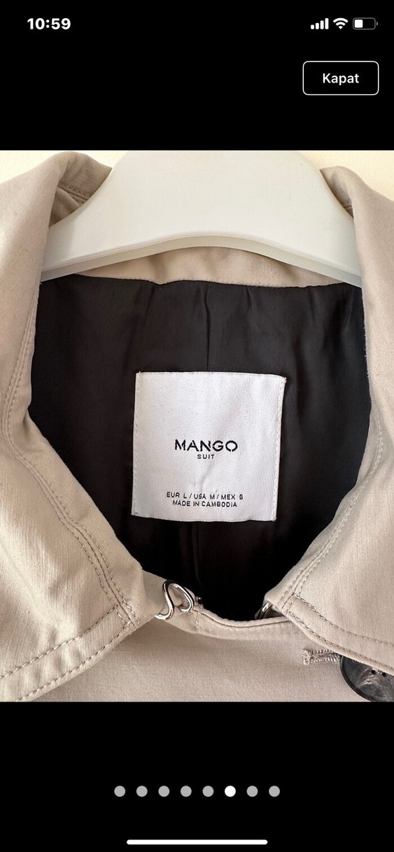 Bej renkte, düğmeli ve normal uzunlukta kadın trençkot. Uzun kollu, yakası kesik ve baskılı desene sahip. Günlük rahat kullanıma uygundur. Marka: Mango.