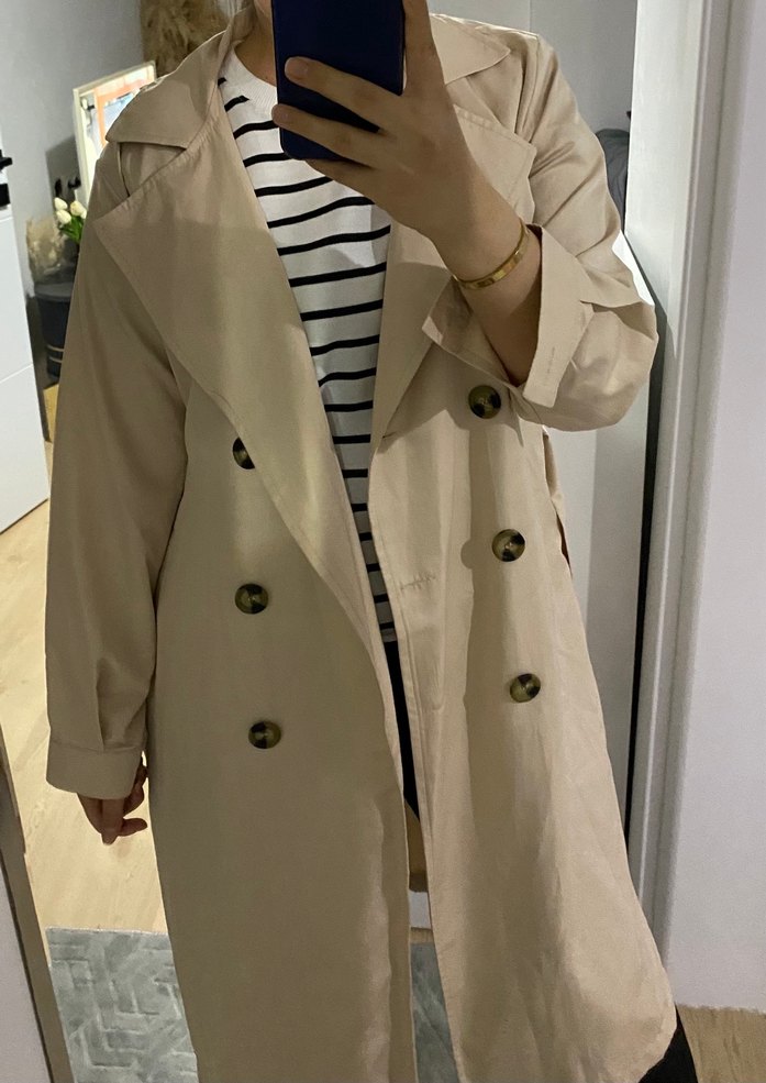 Bej renkli, düğmeli, uzun kollu, normal boyda gevşek kesim kadın trençkot. Notch yakalı ve desensiz, günlük kullanıma uygun.Etiketi yeni çıkarıldı.Hiç kullanılmadı.