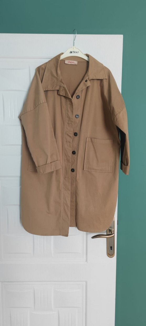 Bej renkli, keten kumaştan yapılmış, düğmeli ve notlu yakalı, uzun kollu, rahat kesim midi kadın gömleği. Günlük kullanıma uygundur.