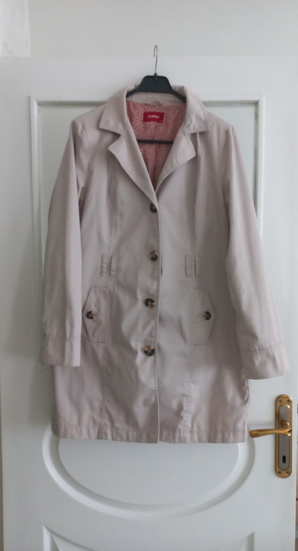 Bej renkli, düğmeli midi uzunlukta, uzun kollu ve kruvaze yakalı kadın trençkot. Rahat kesim ve yumuşak keten kumaştan üretilmiştir. yeni gibi tertemiz sadece kemeri eksik