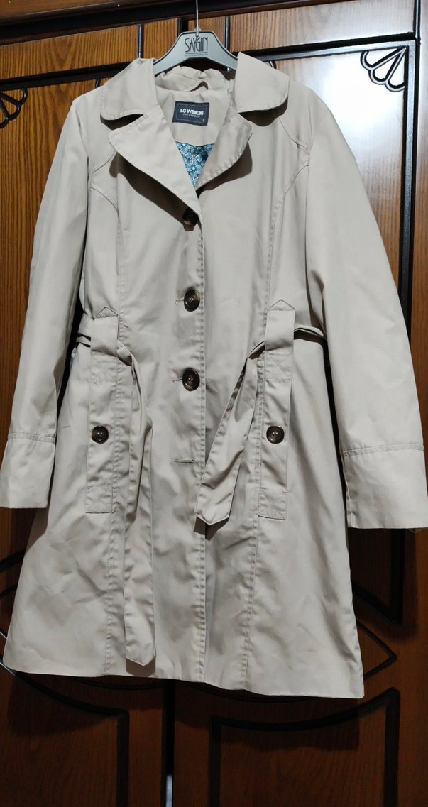Düğmeli, bej renkli kadın trençkot. Notch yaka, sentetik kumaş, strappy kollu, midi boy ve regular fit. Günlük sokak stiline uygun.