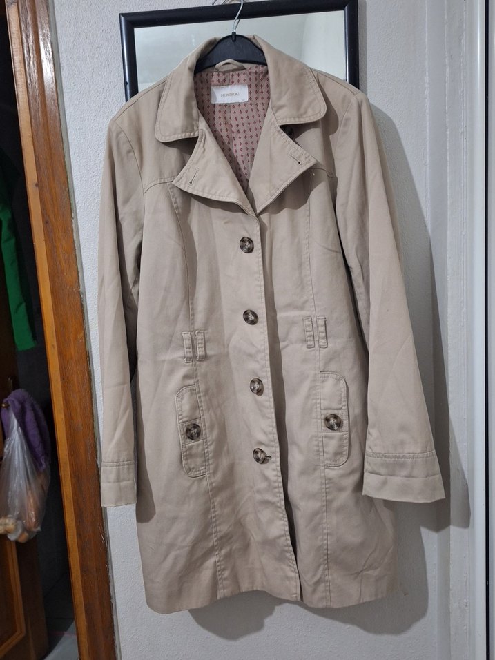 Bej renkli, düğmeli midi trençkot. Notlu yaka ve uzun kollu, sentetik kumaştan, günlük sokak tarzı için uygun, desensiz ve regular fit.