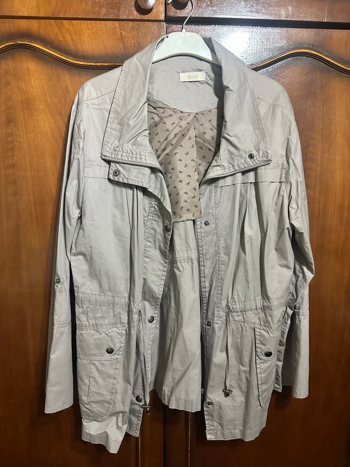 Bej renkte, keten kumaştan, düğmeli ve notalı yaka detaylı, uzun kollu, bol kesim midi uzunluğunda kadın yağmurluk. Rahat ve şık bir günlük stil için uygun.