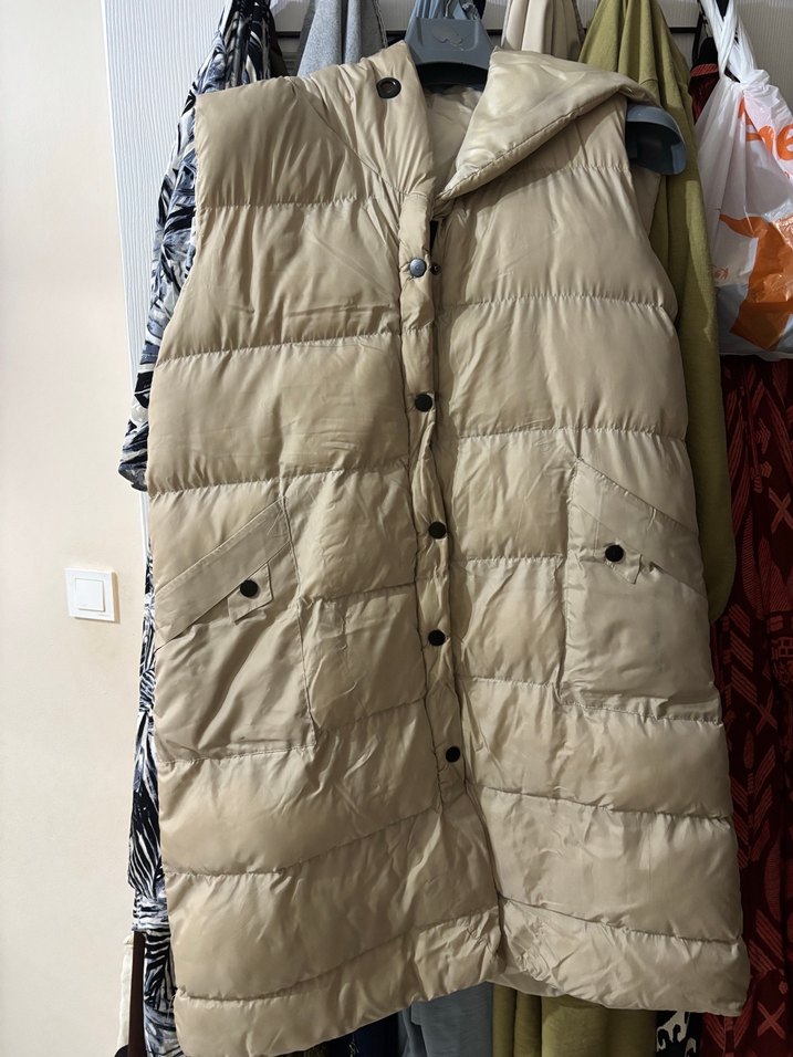Düğmeli, kolsuz, bej renkte, yumuşak sentetik kumaştan midi uzunlukta ve bol kesim kadın yelek. Günlük rahat sokak stili için uygun.