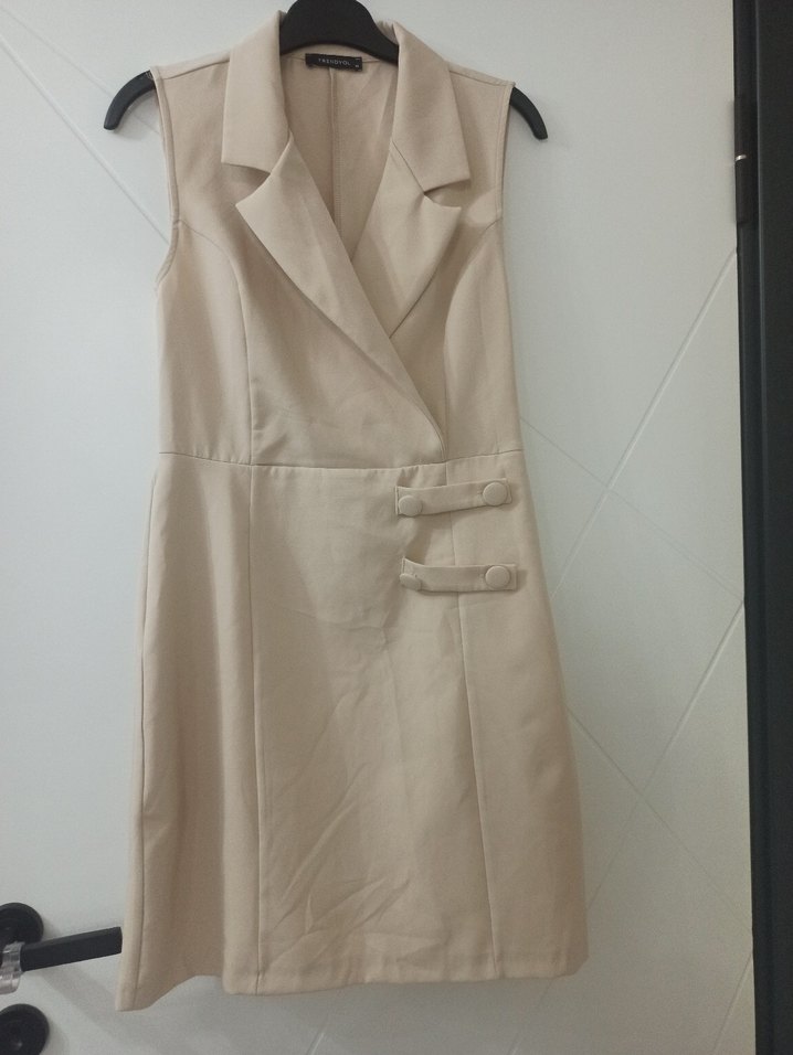 Bej renkte, düğmeli ve yakalı midi uzunlukta, kolu olmayan kadın yeleği. Sentetik kumaştan ve ofis kullanımı için uygundur.