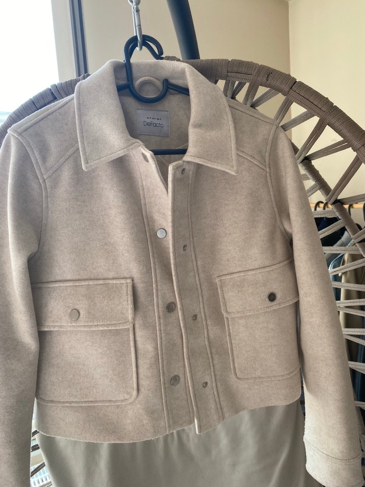 Düğmeli ön, kırık yaka ve uzun kollu kadın yün kaban. Bej-gri renkte, rahat kesim ve midi boyda, gündelik sokak stiline uygun.