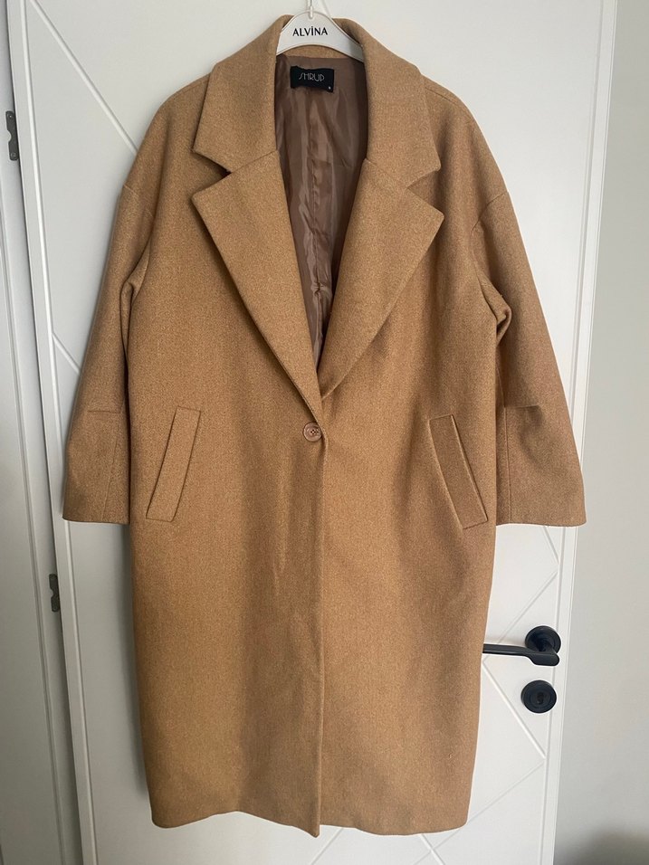 Bej renkli, düğmeli, yün kumaştan midi boy kadın kaban. Notlu yaka, uzun kollu ve normal kesim ile ofis ve günlük kullanıma uygun. medium benden ama oversize kalıp large ve xl bedenlerde rahatlıkla kullanabilir