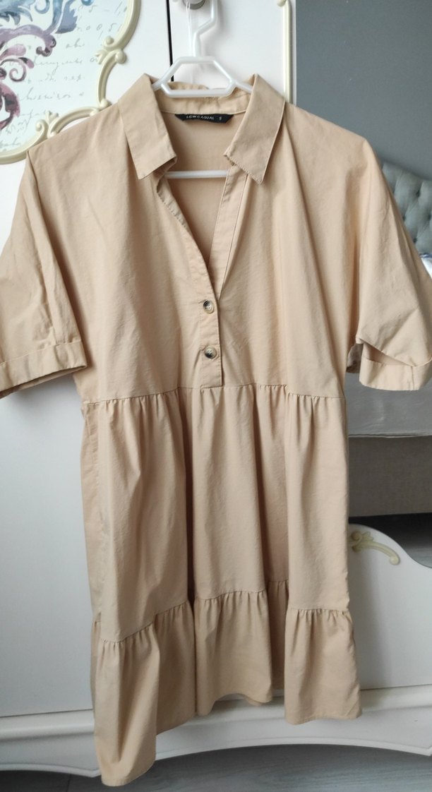Düğmeli, kısa kollu ve yakalı bej midi elbise. Yumuşak keten kumaştan, rahat ve bol kesimdir. Günlük kullanıma uygundur. S beden lakin kesimi bol