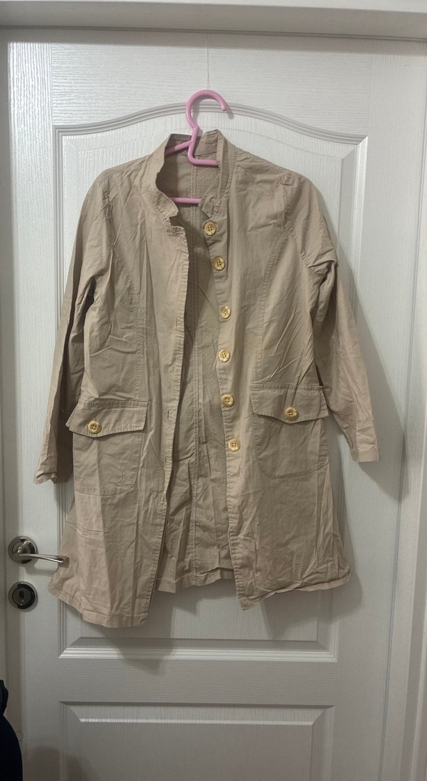 Bej renkte, keten kumaştan yapılmış, uzun kollu, düğmeli ve normal boyda midi kadın ceket. Salaş kesimiyle rahat ve günlük kullanıma uygun. bej rengi tertemiz hiçbir lekesi yok hiçbir sorun yok içinde astar yok keten çok ince yazlık zamanım olmadığı için ütüleyemedim fiyatı çok uygun tuttum