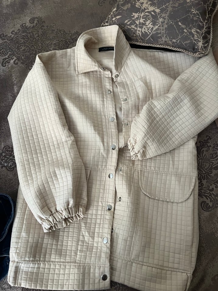 Gevşek kesim, uzun kollu, düğmeli bej keten ceket. Notlu yaka ve ön ceplerle rahat sokak stili sunar. Günlük kullanıma uygundur.