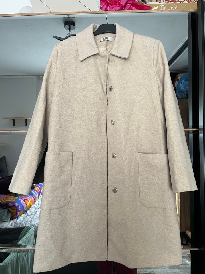 Bej renkte, keten kumaştan midi uzunlukta kadın kaban. Düğmeli ve cepli, regular fit kesimle günlük kullanıma uygun, minimal ve trend sokak stiline uyumlu.