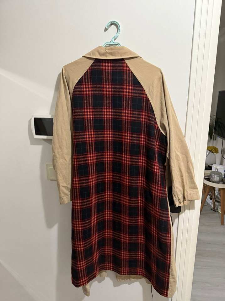 Uzun kollu, düğmeli ve bej renkte sentetik kumaştan yapılan bu hamile kaban, sırtında koyu kırmızı-siyah ekose deseni ile rahat bir kesime sahiptir.