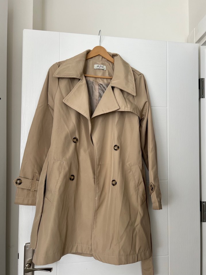 Bej düğmeli, notalı yakalı, uzun kollu midi trençkot. Rahat kalıp ve sentetik kumaştan, günlük rahat sokak stili için uygun. Beden uymadığı için satıyorum bir Instagram Butiğiden almıştım kumaşı çok kaliteli herhangi bir kusuru yok.