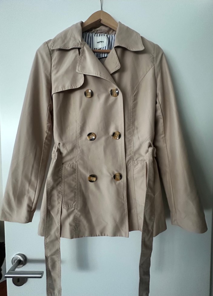 Bej renkli, düğmeli ve kesimli yakalı trençkot. midi boyda, günlük kullanıma uygun
