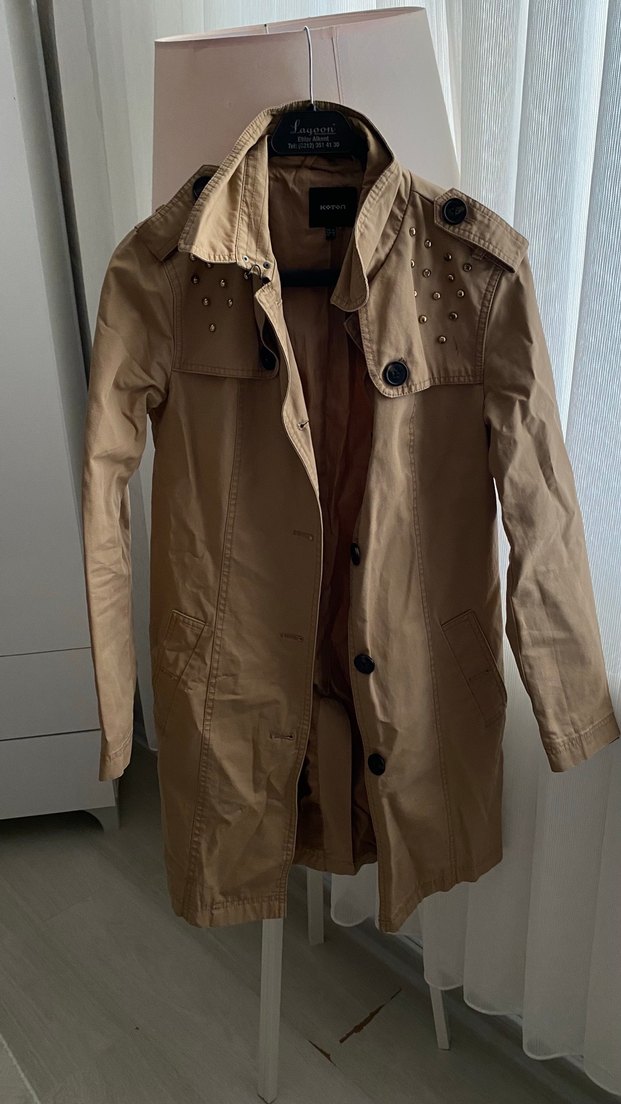 Bej renkli, düğmeli midi trençkot, kesik yaka ve uzun kollu. Sentetik kumaştan, günlük sokak stiline uygun regular fit.