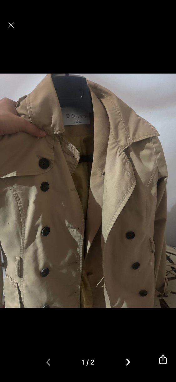 Bej renkli, düğmeli ön ve kesimli yaka detaylı midi trençkot. İnce kesimi ve uzun kolları ile şık, günlük sokak stili için uygun. Sentetik kumaştan üretilmiştir.