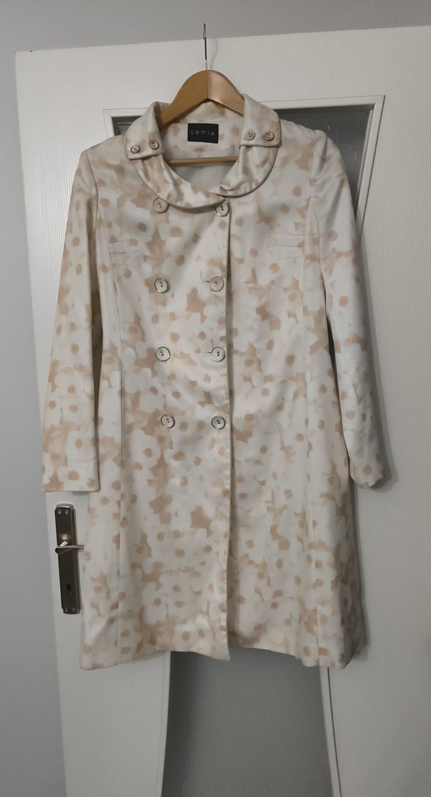 Düğmeli bej midi trençkot, keskin yaka ve uzun kollu. Hafif batik desenli, sentetik kumaştan, günlük kullanıma uygun rahat kesim.❗rengi kremdir yoğunluk olarak ama renk seçiminde krem olmadığı için ten rengi seçimi yaptım pantolon uzun ceket takımdır ➡️ sondan iki resimde iki yerinde ip çekilmeleri var küçücük onun harici gayet iyi durumda kilo almamdan dolayı giyemiyorum