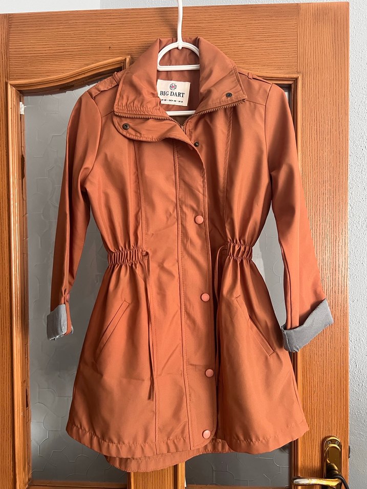 Ürünü hiç giymedim sadece ambalajından çıkardım rengi çok hoş fotoğrafta biraz açık görünmüş ama tam olarak tarçın renginde bedeni bana uymuyor o yüzden satıyorum Bej renkli, düğmeli midi yağmurluk, notched lapel yaka ve uzun kollu