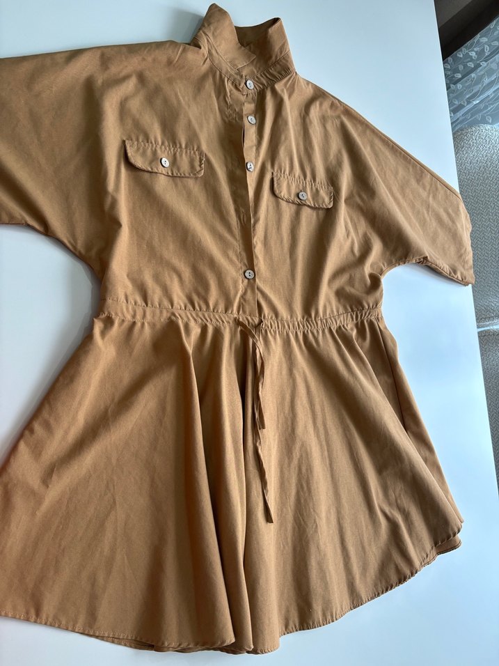 Bej renkli, düğmeli, yakalı ve kısa kollu elbise. Belden bağcıklı, bol kesim ve midi boyda, günlük sokak stili için uygun.