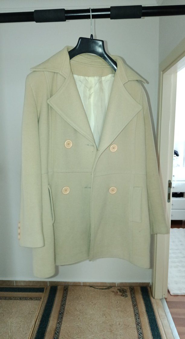 Bej renkli, düğmeli ve normal boy mini kaban. Uzun kollu, regular fit ve yumuşak, sıcak tutan kumaştan yapılmıştır. Desensiz ve günlük kullanıma uygundur. Tekliflere açığım.