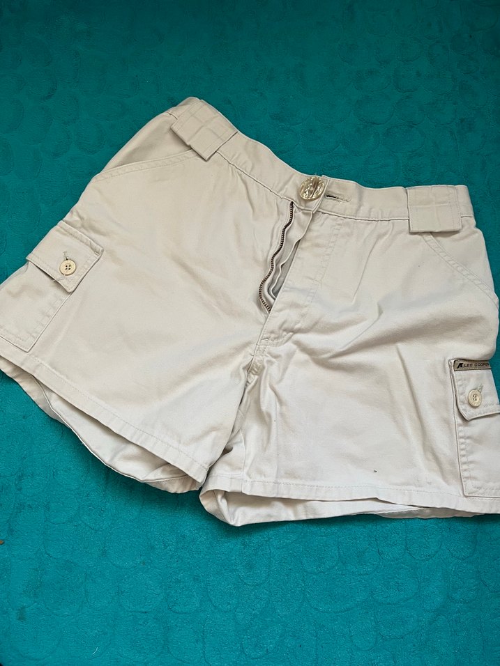 Bej renkli, düğmeli, bol kesim mini şort. Pamuklu kumaştan, günlük ve sokak stiline uygun.