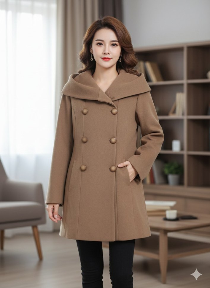 Bej renkte, düğmeli, modern klasik tarzda, orta uzunlukta kadın kaban. Notched lapel yaka ve uzun kollu, rahat kesim, yumuşak ve sıcak kumaştan üretilmiştir.