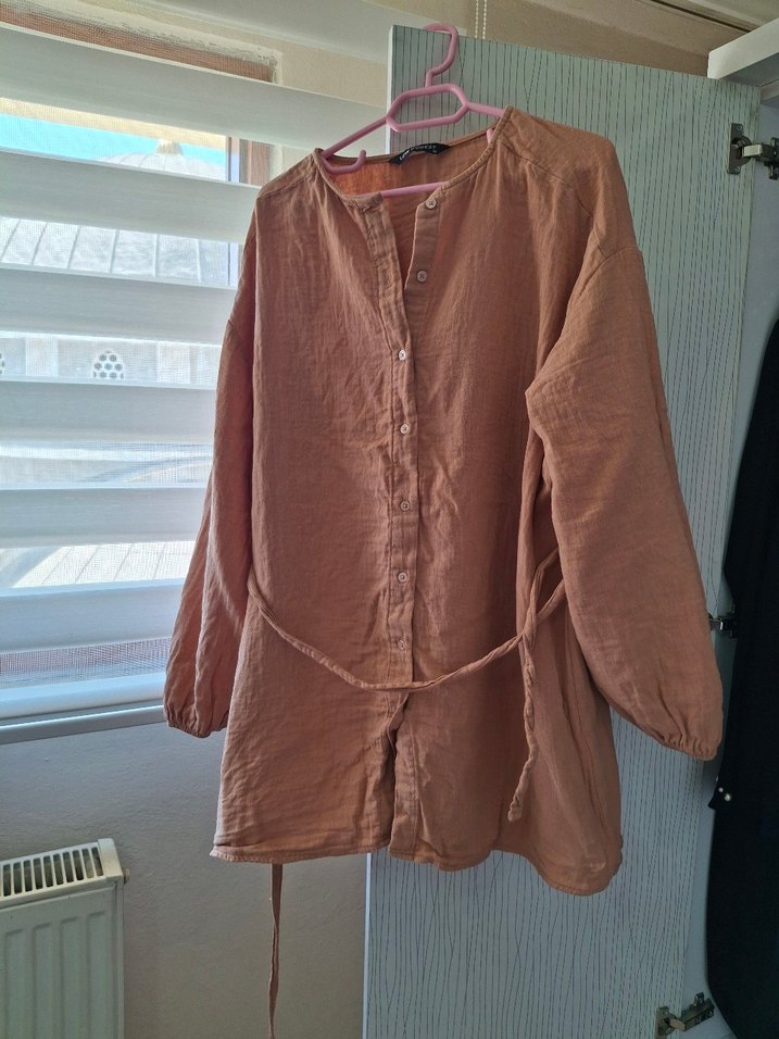 Bej-pudra renkli müslin kumaştan, düğmeli, uzun kollu ve midi boyda, rahat kesim gömlek. Yuvarlak yakalı, günlük kullanıma uygun.
