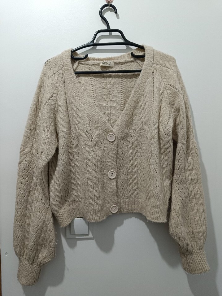 Bej renk, düğmeli, uzun kollu, rahat kesim örgü hırka. Günlük kullanıma uygun, sıcak dokulu bir tasarım.