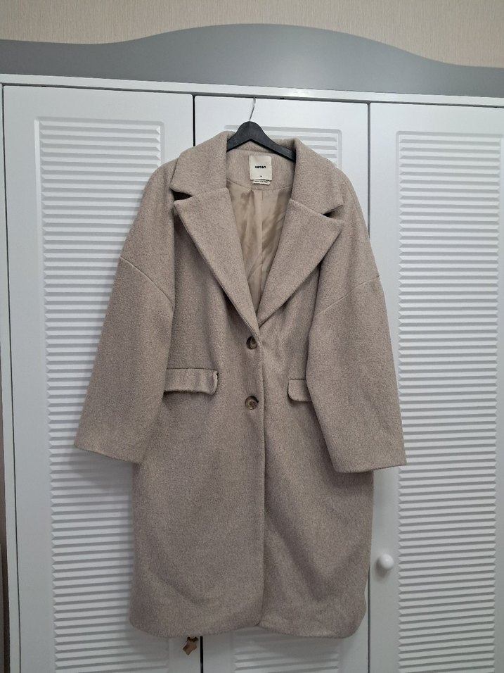 Bej renkte, yumuşak dokulu, oversize kesim kaban. Büyük yakalı, iki düğmeli ve önünde iki cep bulunur. İç kısmı astarlıdır. deformasyonu yoktur