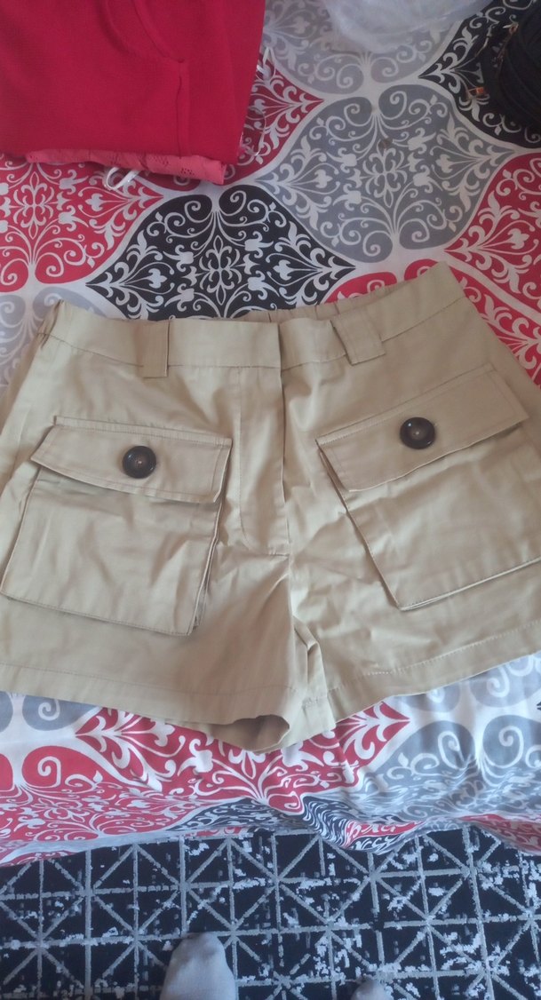 Bej renk, pamuklu kumaştan, düğmeli cepleriyle rahat kesim hamile mini şort. Günlük sokak stili için uygundur.