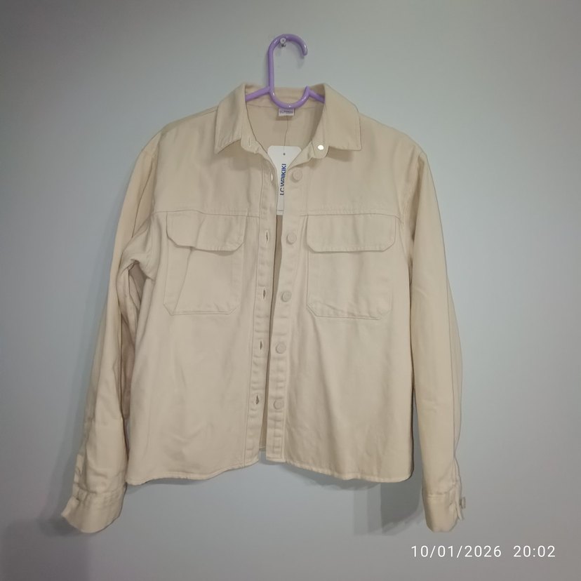 Bej renkte, düğmeli ve pamuklu uzun kollu gömlek. Salaş kesimi ve notched yakasıyla günlük rahat sokak stili sunar. yeni kullanılmadı etiketi üzerinde
