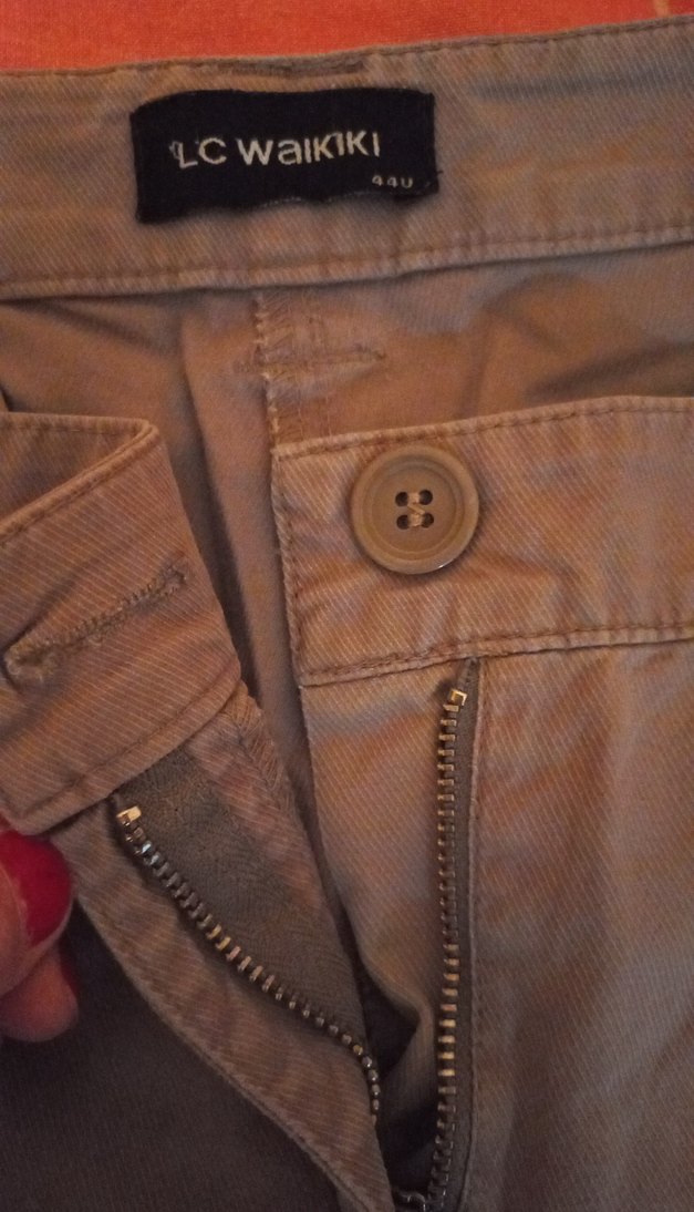 Bej renkte, düğmeli ve fermuarlı pantolonu. Yumuşak süet kumaştan, rahat ve günlük kullanıma uygun.